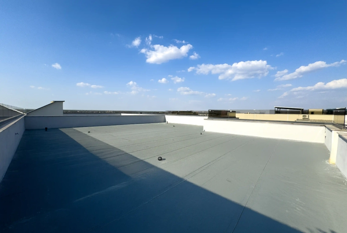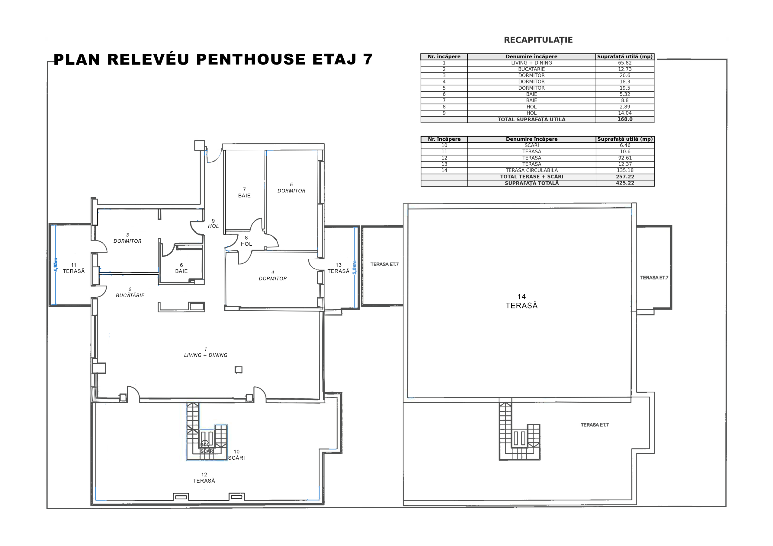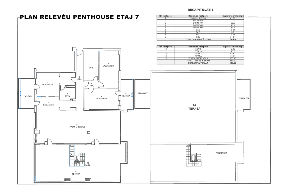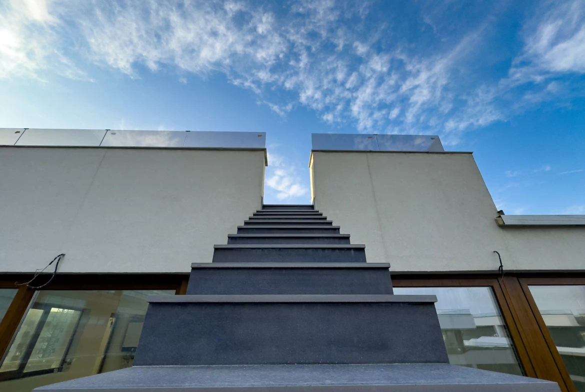 Suprafața totală este de 425 mp, din care 168 mp utili și restul terase generoase, incluzând o terasă principală de 92 mp cu acces direct din living și un rooftop privat de 135 mp, panoramic.